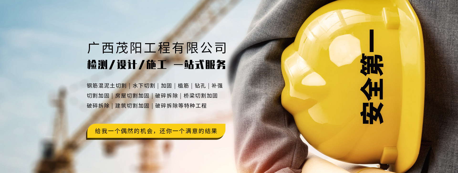 • 廣西茂陽(yáng)工程有限公司,是一家鋼筋混泥土切割,水下切割、加固、植筋、鉆孔、補(bǔ)強(qiáng)、切割加固、房屋切割加固/破碎拆除、橋梁切割加固/破碎拆除、建筑切割加固/破碎拆除等特種工程的施工隊(duì)伍